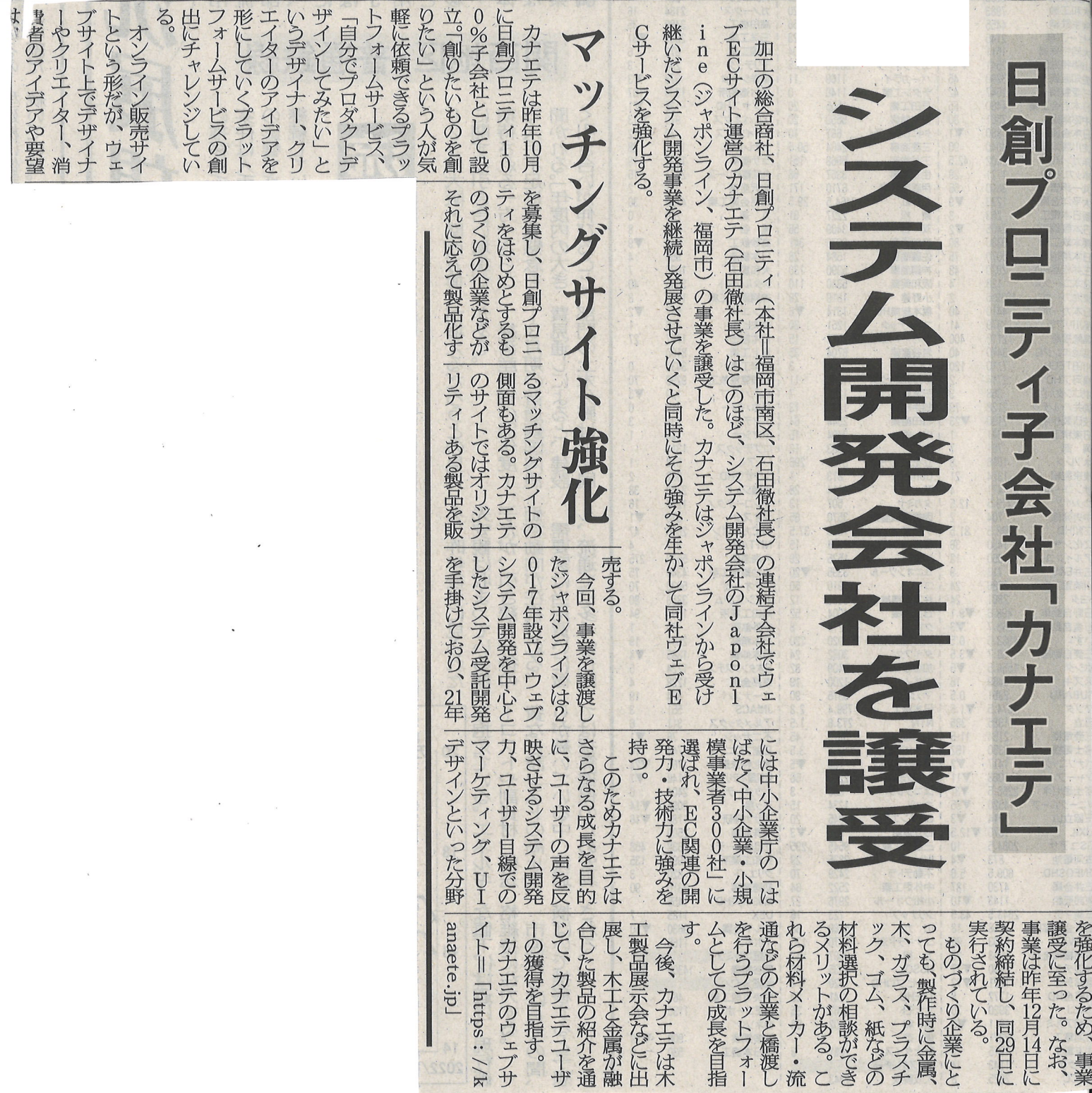 日刊産業新聞に、日創プロニティの連結子会社として当社が掲載されました。 当社の運営WEBサイト: Kanaete(カナエテ) – アイデアをカタチにするものづくりWEBサービス ものづくりWEBサービス「Kanaete」オープンのお知らせ 前の記事 「金属素材販売サービス」提供開始しました 次の記事