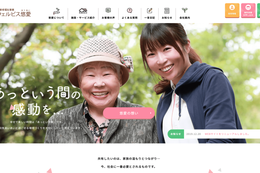 「女性社長が経営する介護施設で、優しい雰囲気をWEBサイトで表現できないか?」というクライアント様の要望に対し、特にデザインにこだわり作成しました。ウェルビス悠愛様のテーマカラーである、「ピンク・イエロー・グリーン」と極力角を作らないことで柔らかなデザインに仕上げました。